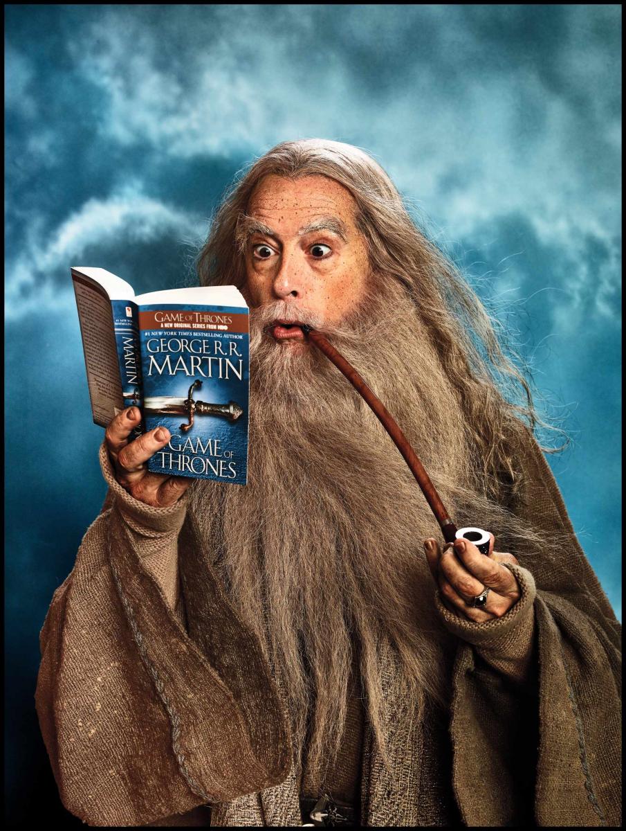 Colbert, as Gandalf, peruses a page-turner.