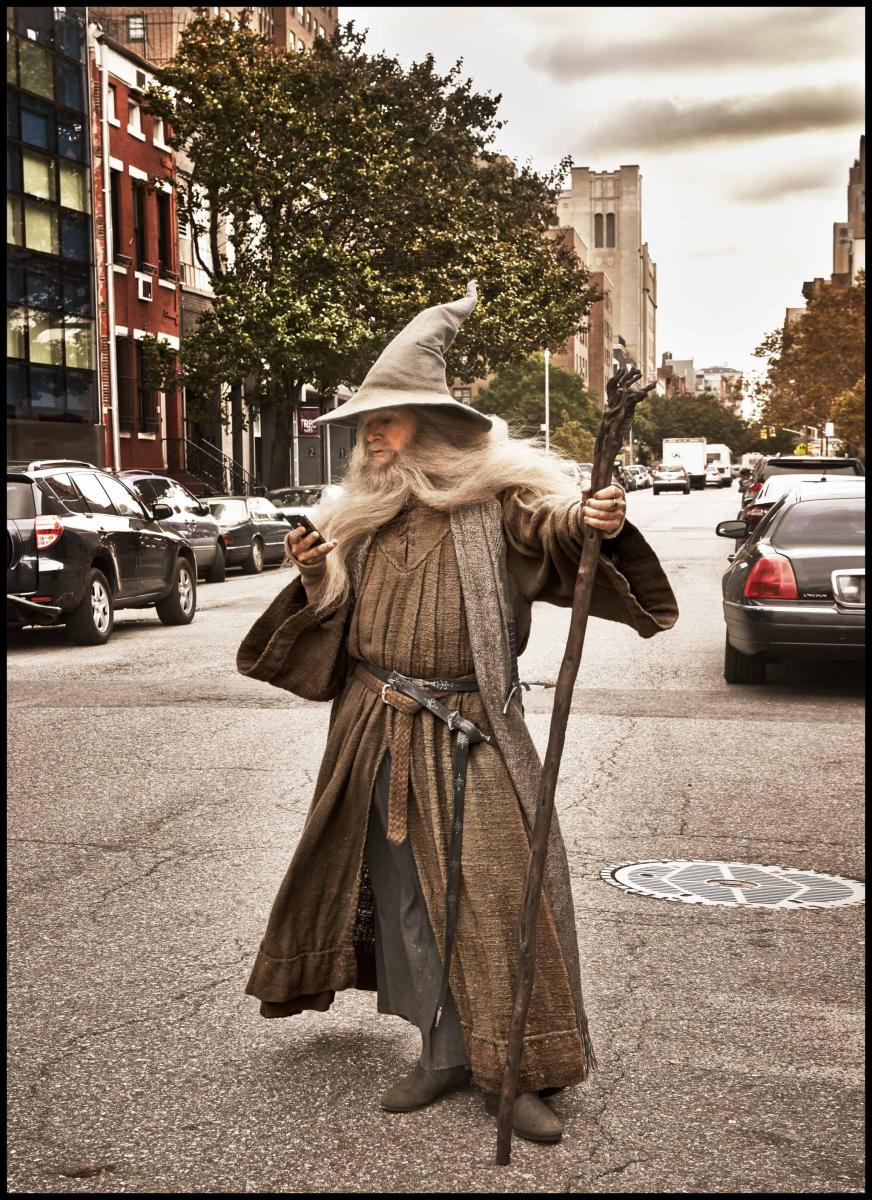 Colbert, as Gandalf, checks his inbox.