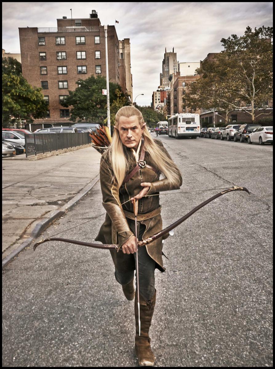 As Legolas, Colbert stalks New York City, bow in hand.